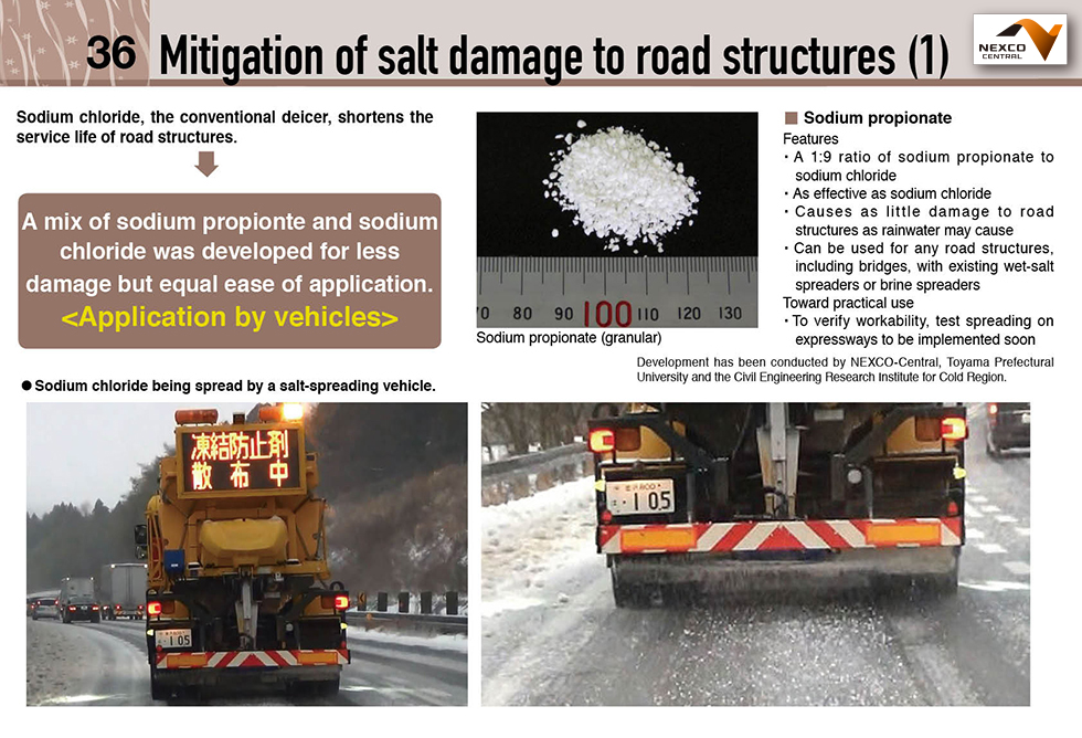 On expressways operated by Nexco Central, sodium chloride has been the conventional deicer. However, sodium chloride shortens the service life of road structures. Toward mitigating salt damage to these structures while maintaining deicing effectiveness and economy, we have been developing a new deicer since 2015. It is a mixture of sodium propionate and sodium chloride. Field test results show that a 1:9 ratio of sodium propionate to sodium chloride achieves good results.